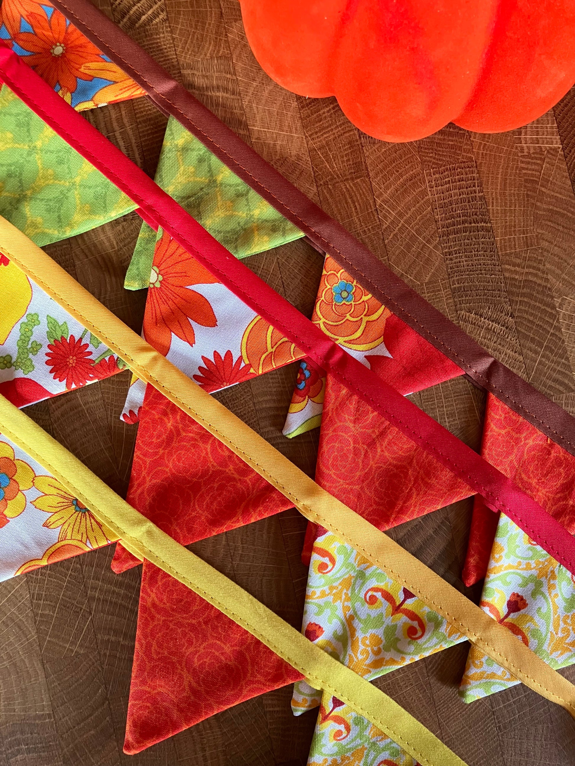 These banners were made by me, on a Juki TL-2010Q, using Gutermann polyester thread. The pennants are attached to bias tape binding, with extra on each end for hanging.