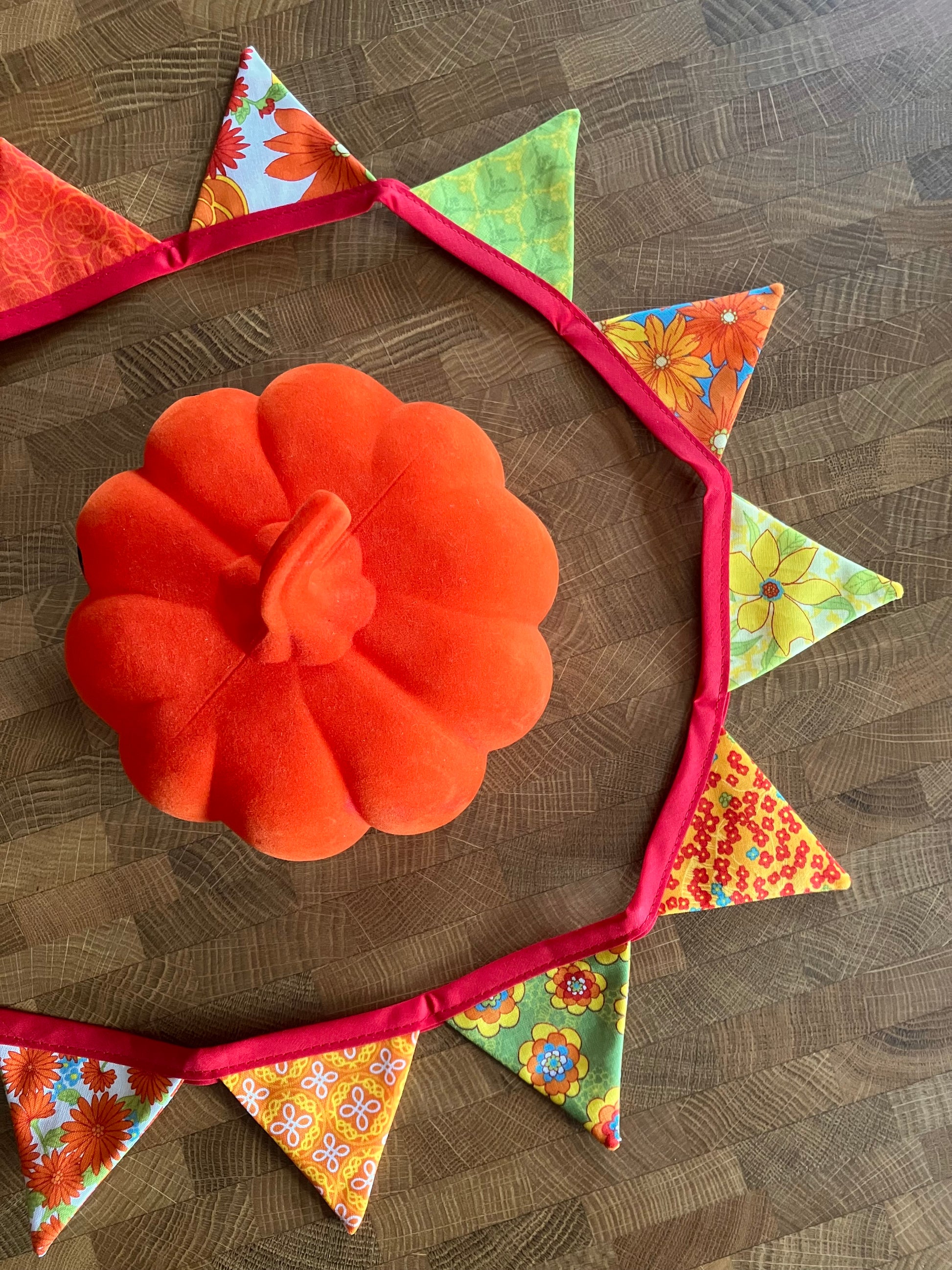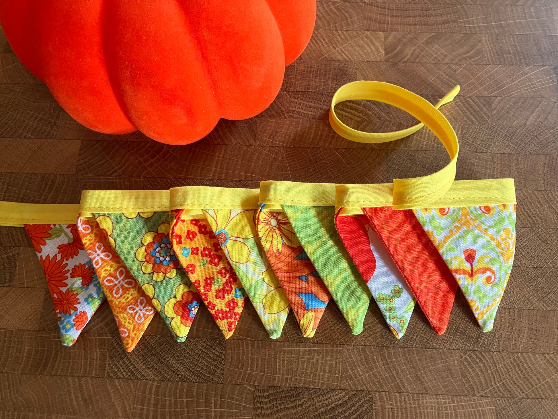 These banners are double-sided, and look great from either side; however, all pennants technically have a "front" side and a "back" side, based on the way I chose their layouts. You can certainly hang them however you'd like, but during assembly, I inspect both sides of every single pennant to see which side I think looks the best, ie: best imagery, prettiest colors, nicest pattern layout, etc., and that "best" side becomes the "front" side of the banner. I also fussy cut some of the fabrics to specifically fit within the triangle constraints, like framing a witch or a trick-or-treater. In that instance, it's clear which side is technically the "front."