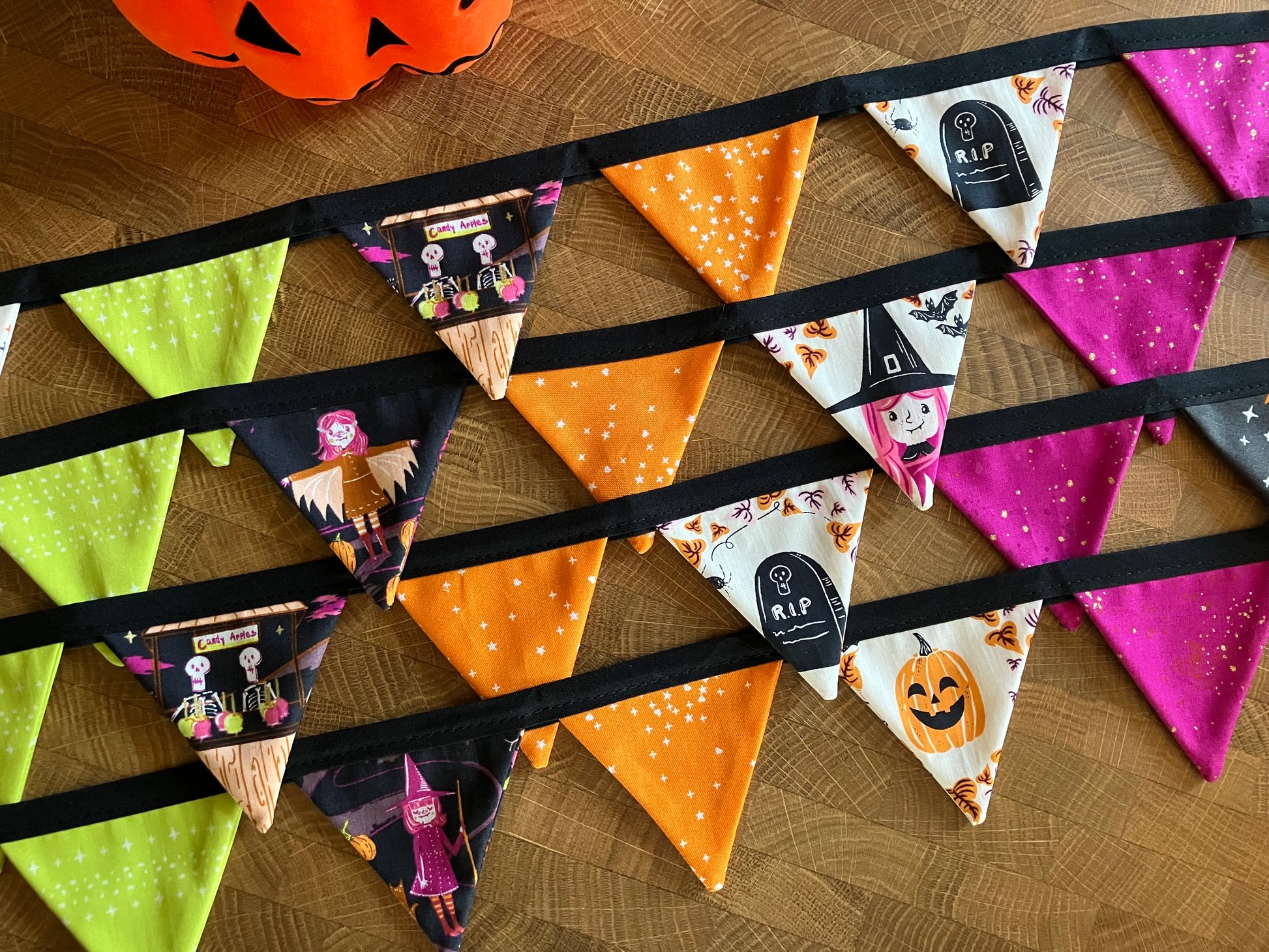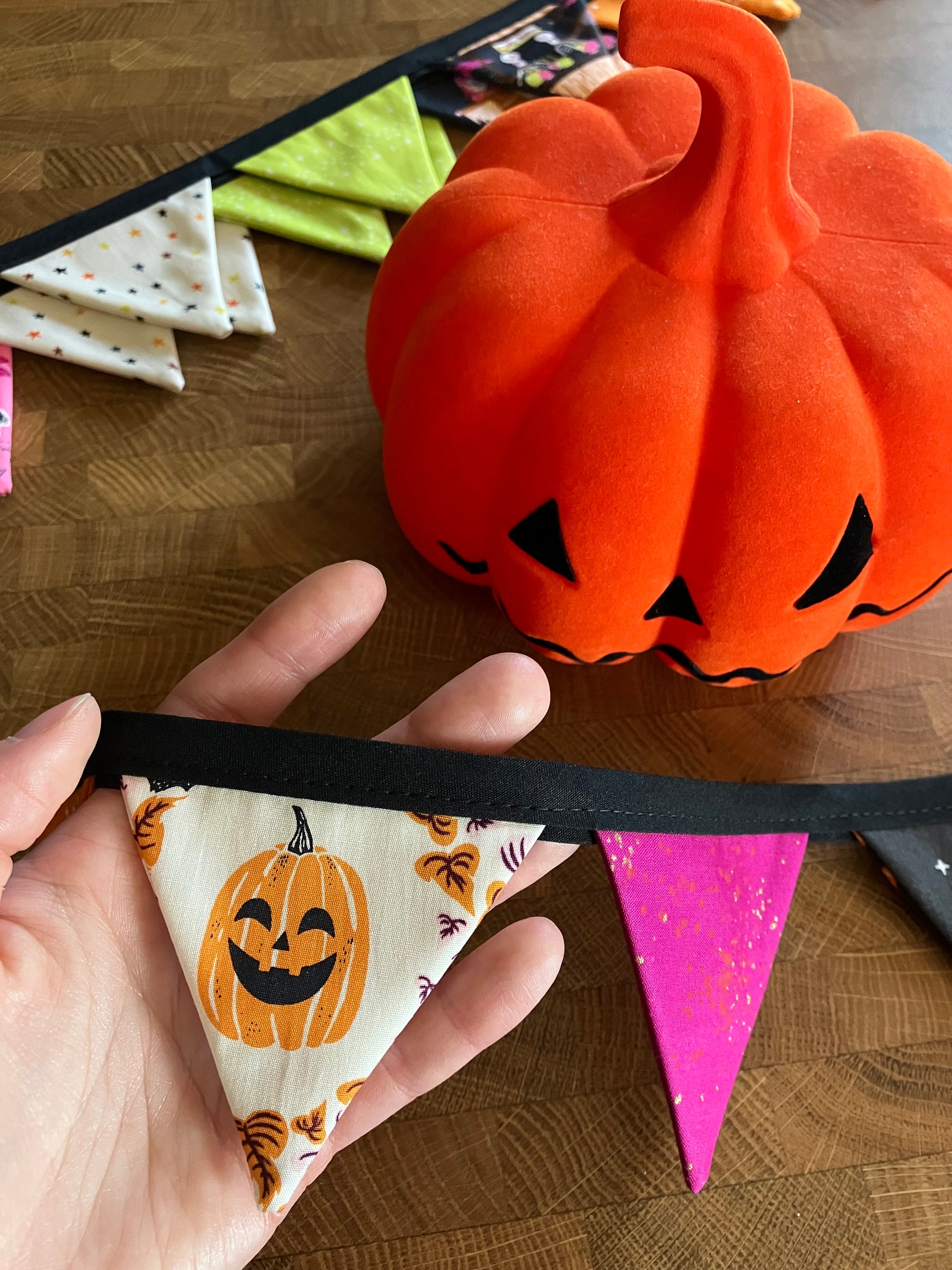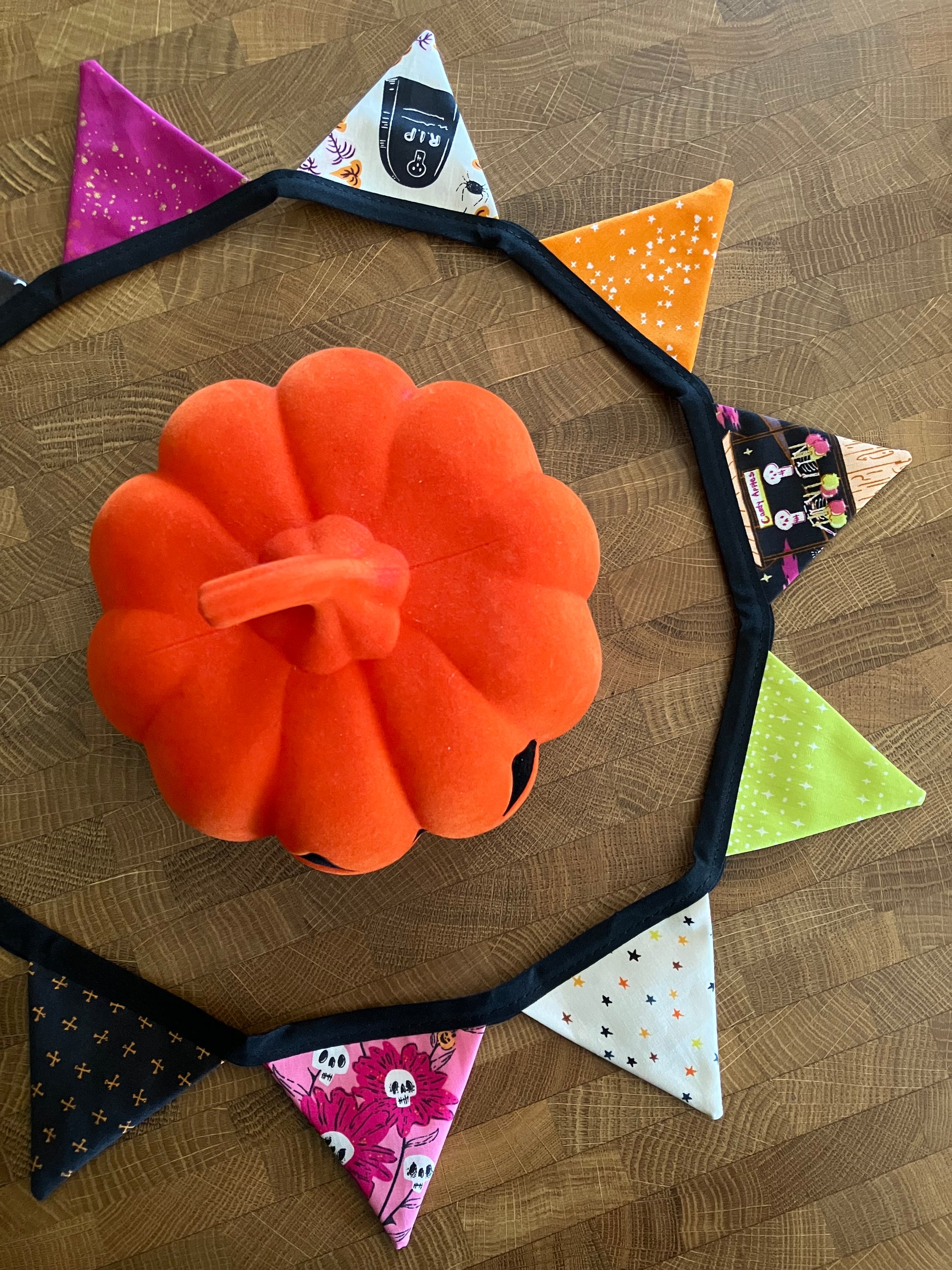 These banners are double-sided, and look great from either side; however, all pennants technically have a "front" side and a "back" side, based on the way I chose their layouts. You can certainly hang them however you'd like, but during assembly, I inspect both sides of every single pennant to see which side I think looks the best, ie: best imagery, prettiest colors, nicest pattern layout, etc., and that "best" side becomes the "front" side of the banner. I also fussy cut some of the fabrics to specifically fit within the triangle constraints, like framing a witch or a trick-or-treater. In that instance, it's clear which side is technically the "front."