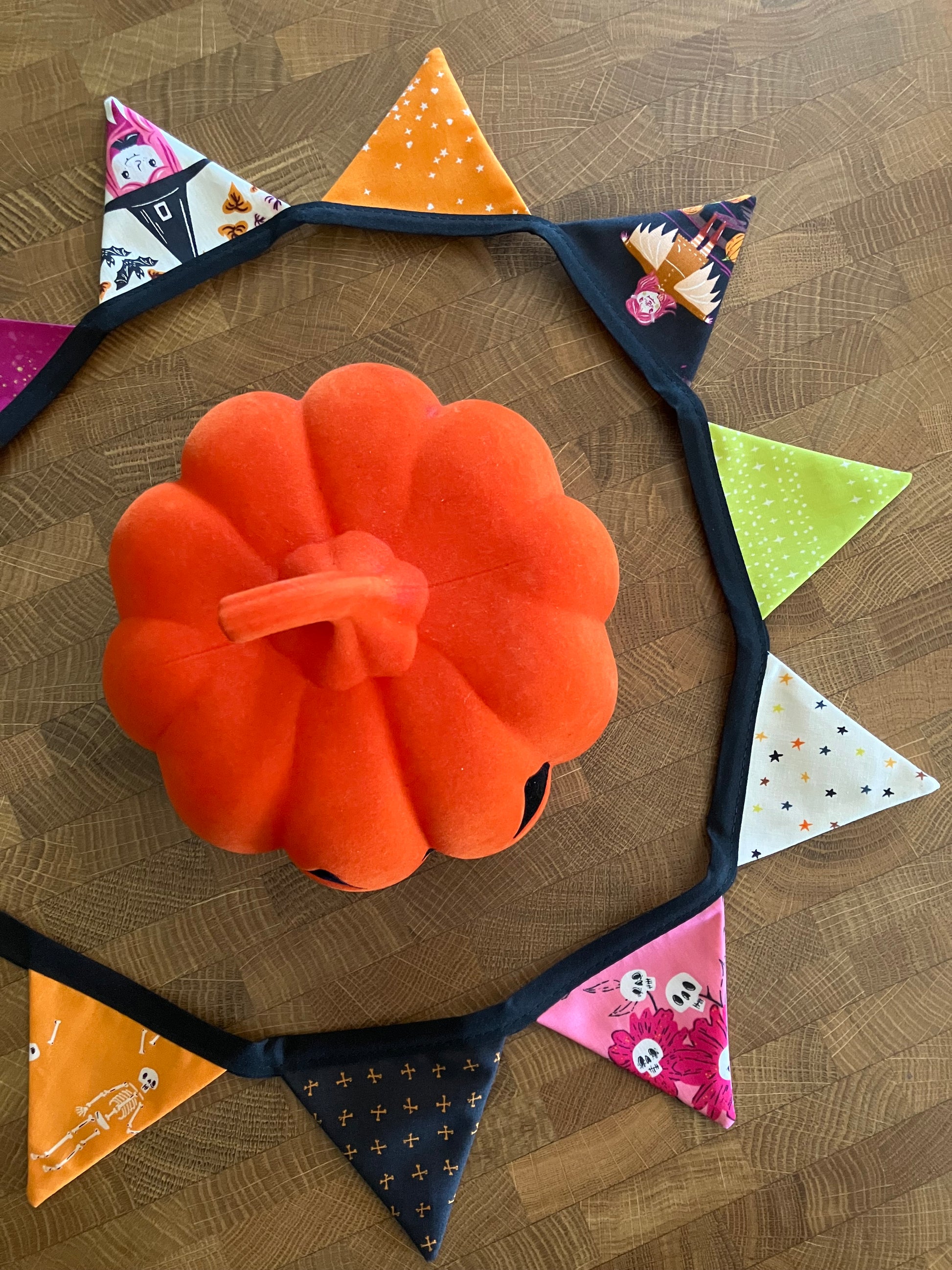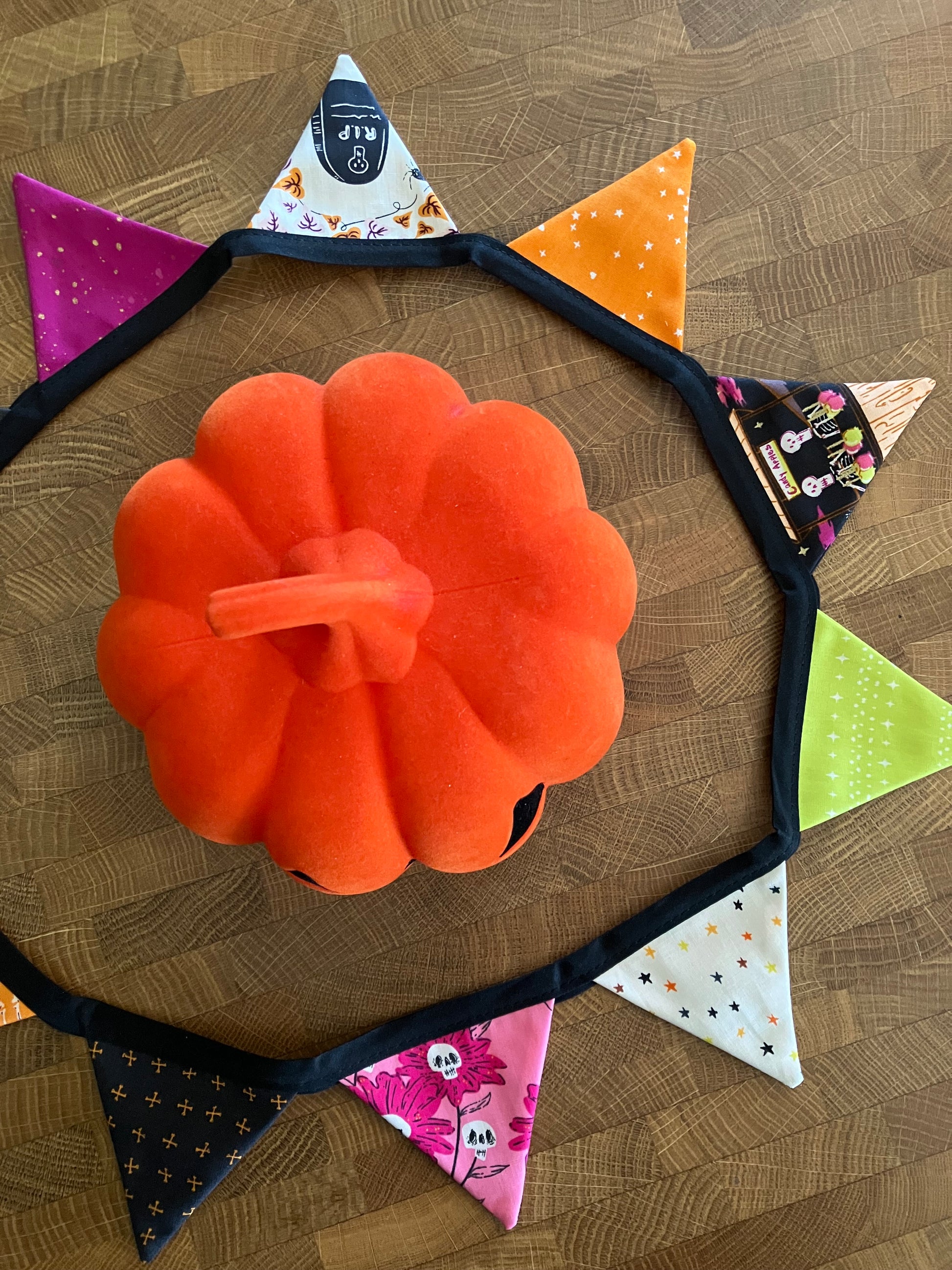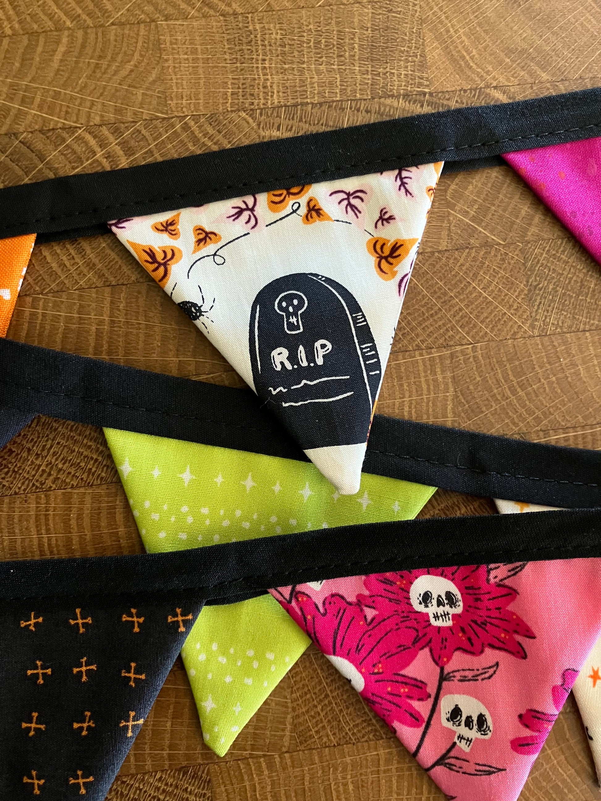 These banners are double-sided, and look great from either side; however, all pennants technically have a "front" side and a "back" side, based on the way I chose their layouts. You can certainly hang them however you'd like, but during assembly, I inspect both sides of every single pennant to see which side I think looks the best, ie: best imagery, prettiest colors, nicest pattern layout, etc., and that "best" side becomes the "front" side of the banner. I also fussy cut some of the fabrics to specifically fit within the triangle constraints, like framing a witch or a trick-or-treater. In that instance, it's clear which side is technically the "front."